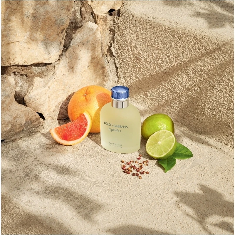 Dolce & Gabbana Light Blue Pour Homme er en citrus aromatisk herreduft. Den indeholder topnoter med siciliansk mandarin, enebær, grapefrugt og bergamotte. I hjertenoten findes der duftnoter af rosmarin, brasiliansk rosentræ og peber, som afrundes elegant i bundnoten med moskus, eg mos og røgelse. Disse noter udgør tilsammen en maskulin og luftig Eau de Toilette.